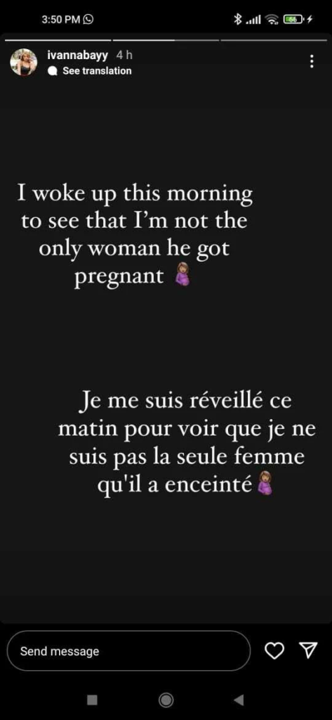 Ivanna Bey, a 22-year-old real estate agent, made her claims via Instagram story posts on Wednesday, June 28, 2023. Her first Instagram story read, “I woke up this morning to see that I’m not the only woman he got pregnant”, alongside its French translation.