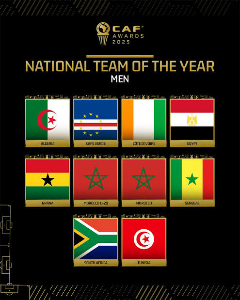 The Confederation of African Football (CAF) has unveiled the nominees for the prestigious National Team of the Year award. A total of 10 teams have been shortlisted for the coveted honour, with Morocco’s U20 team and Cape Verde’s senior national team making the list.