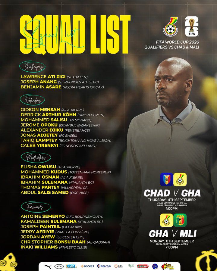 Ghana head coach Otto Addo has named his squad for the crucial September World Cup qualifying double-header that could determine the Black Stars’ route to the 2026 tournament.