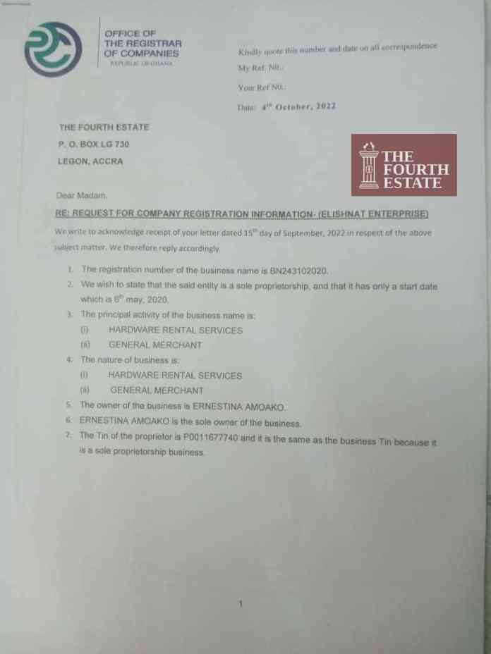 The company, registered as a general merchant and hardware rental services, is also in the name of Ernestina Amoako, the wife of the man who awarded the contract to the company.