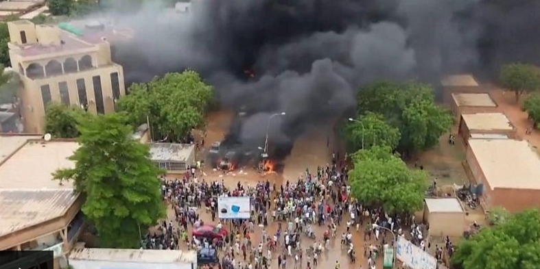 Supporters of a coup in Niger have attacked the headquarters of the ousted president’s party, setting it on fire and stoning and burning cars outside.