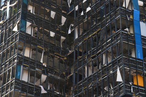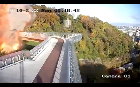 Security camera footage showed shrapnel and flames engulfing a glass-bottomed footbridge across a wooded valley in Kyiv’s centre, one of its most popular tourist sites. One pedestrian could be seen running from the blast. Reuters later saw a crater below the bridge, damaged but still standing.