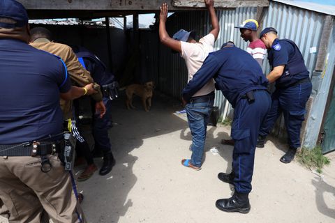 Law enforcement officials search residents in the Marikana informal settlement, in what the Cape Town mayor's office describes as the "biggest anti-crime operation" in the city's history, in which more than 750 law enforcement officers from various units have been deployed, in the Marikana informal settlement and surroundings, in Cape Town, South Africa, October 12, 2022. REUTERS/Esa Alexander