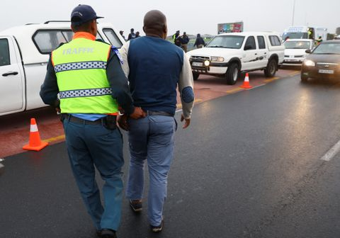 A driver is handcuffed in what the Cape Town mayor’s office describes as the “biggest anti-crime operation” in the city’s history, in which more than 750 law enforcement officers from various units have been deployed in the Marikana informal settlement and surroundings in Cape Town, South Africa, October 13, 2022. REUTERS/Esa Alexander