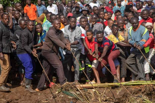 In the picture above, taken in Namakwekwe, by the Nabuyonga river, a man can be seen swimming to try and retrieve bodies caught in a submerged minibus.