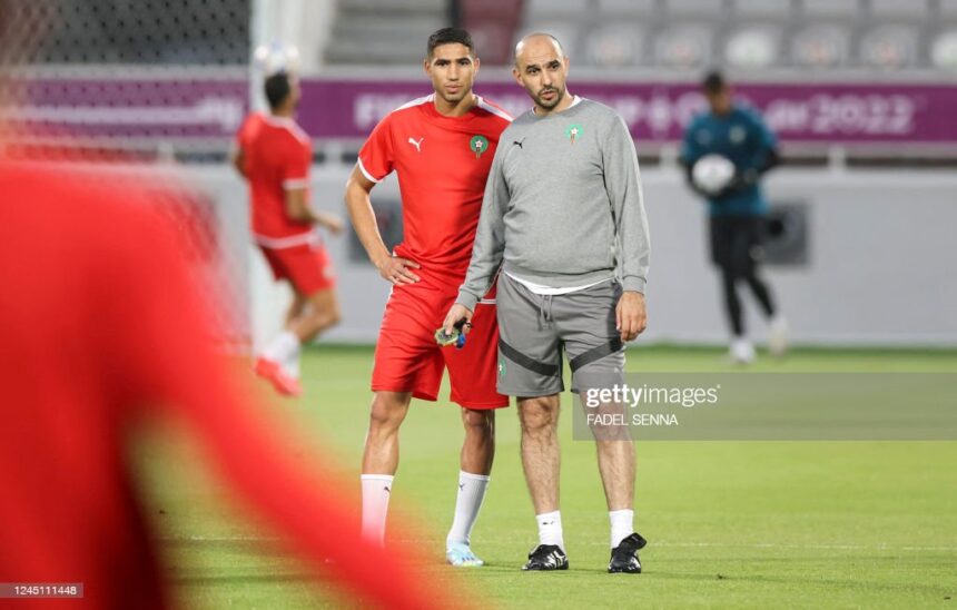 Morocco's defender #02 Achraf Hakimi (L) and Morocco's coach Walid Regragui take part in a training session at Al Duhail SC in Doha on November 26, 2022, on the eve of the Qatar 2022 World Cup football match between Belgium and Morocco. (Photo by FADEL SENNA / AFP) (Photo by FADEL SENNA/AFP via Getty Images)